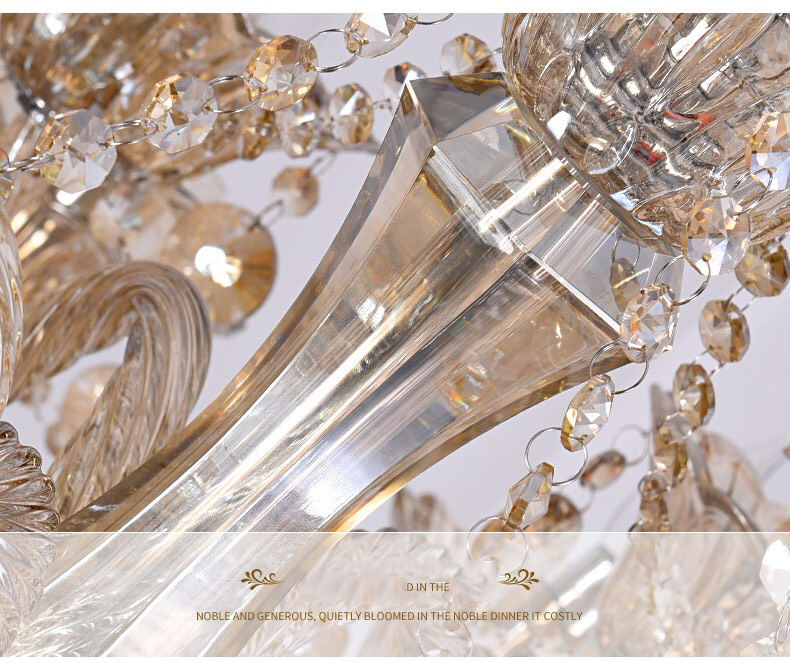 Với vẻ đẹp tinh tế của mình, Đèn Chùm Pha Lê Giọt Trám Màu Rượu Sang Trọng DC234 khiến bất cứ vị khách quý nào cũng trầm trồ sau cái nhìn đầu tiên. Thiết kế của đèn có 15 tay, toả ra nguồn sáng rực rỡ và chan hoà khắp không gian căn phòng. Trên thân đèn còn đính những viên pha lê 7 màu lấp lánh. Khi ánh sáng từ đèn trang trí toả ra và chiếu vào tinh thể pha lê, chúng tạo ra hiệu ứng ánh sáng vô cùng đẹp mắt, tiếp thêm vẻ đẹp rạng rỡ và hoàn mỹ cho căn phòng.